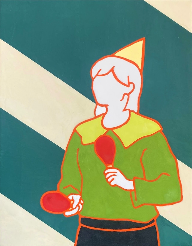 F4(333×242mm)。木製パネル、麻布。フレスコ画/漆喰、アクリル絵の具、顔料。 猫カフェにて。猫は如何にして人に近づかずにエサを貰えるか、人は如何にして猫を誘き寄せて抱っこをするか。心理戦かのような駆け引きを描画。勝敗は絵の中に有り。