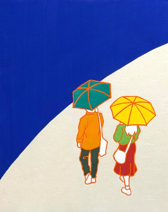 F3(273×220mm) 。木製パネル/雲肌麻紙。 岩絵具。傘の中は、私だけの世界。隣を歩いていても少し遠い。