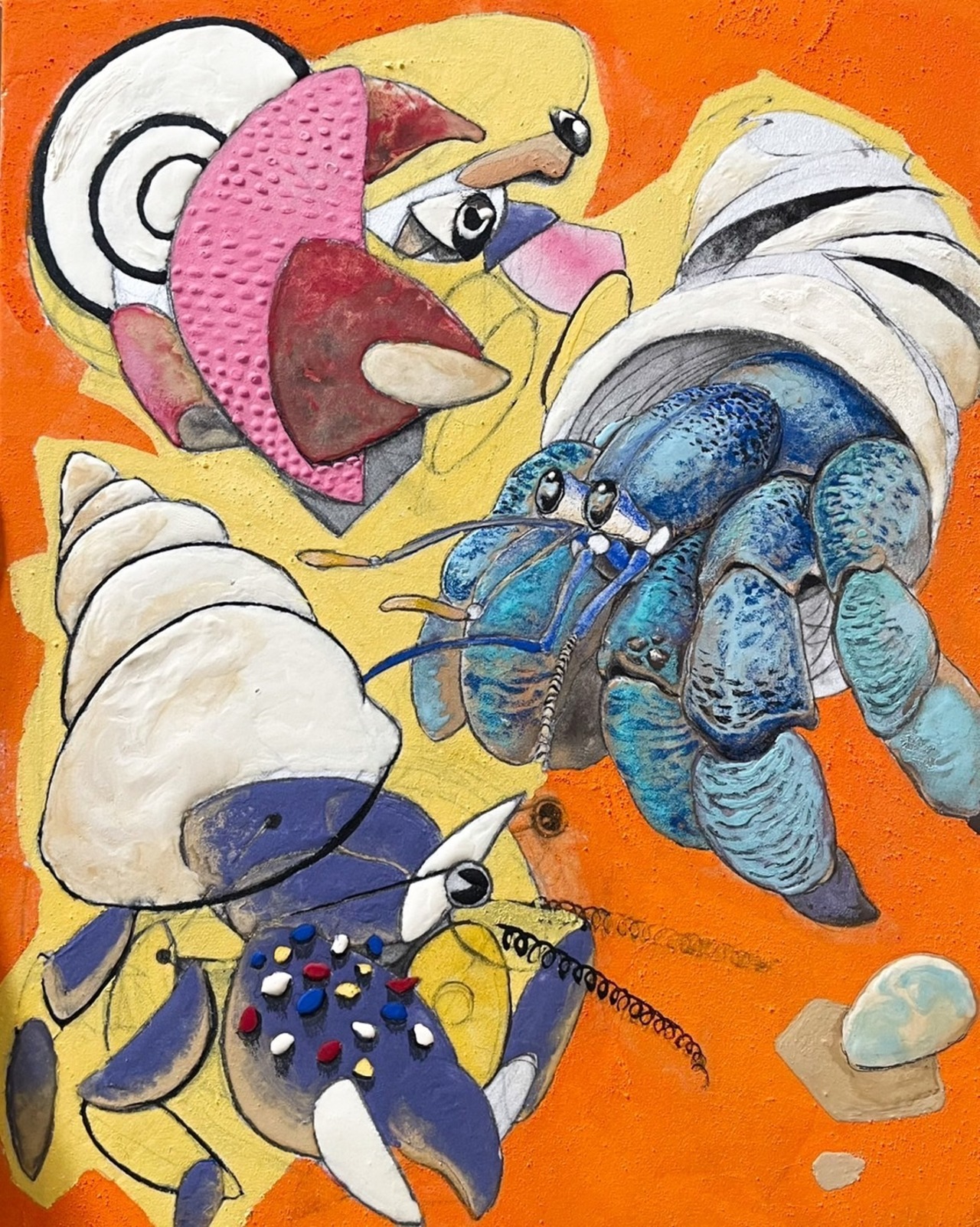 ヤドカリを描写、単純化、色を使って構成した作品。