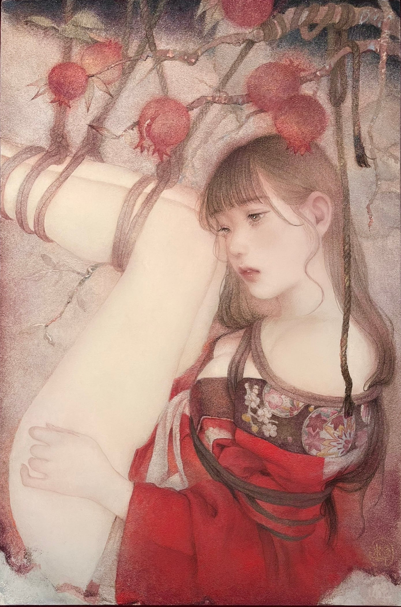 F6(410×318)。木製パネル、白麻紙。岩絵の具、水干、墨、あわび貝。