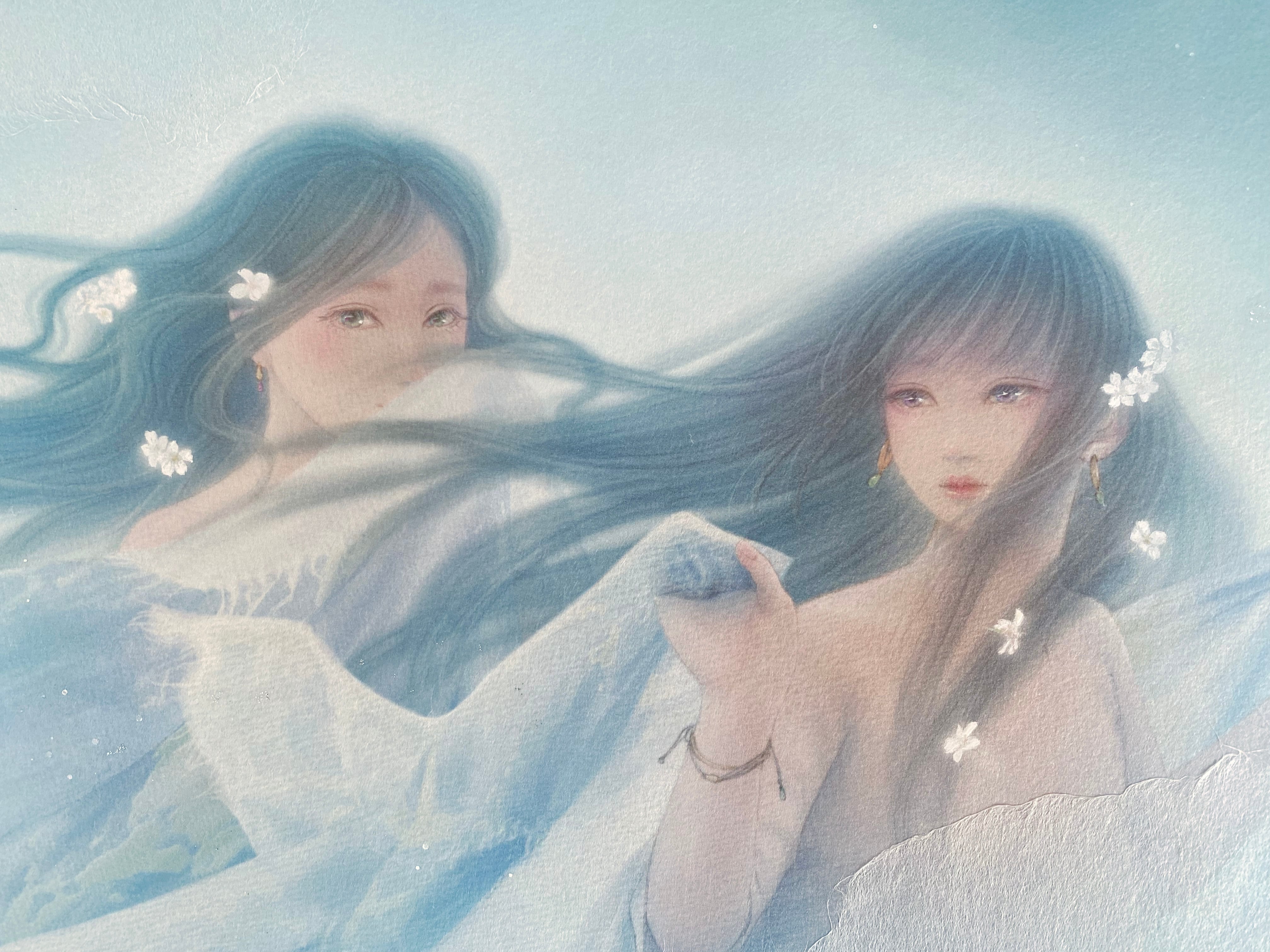 手書きで下図を描き、それをPCに読み込みPhotoshopにて着彩。和紙に出力した後、木製パネルに水張りを行い、そこからまた筆を持ち、顔彩で着彩しております。