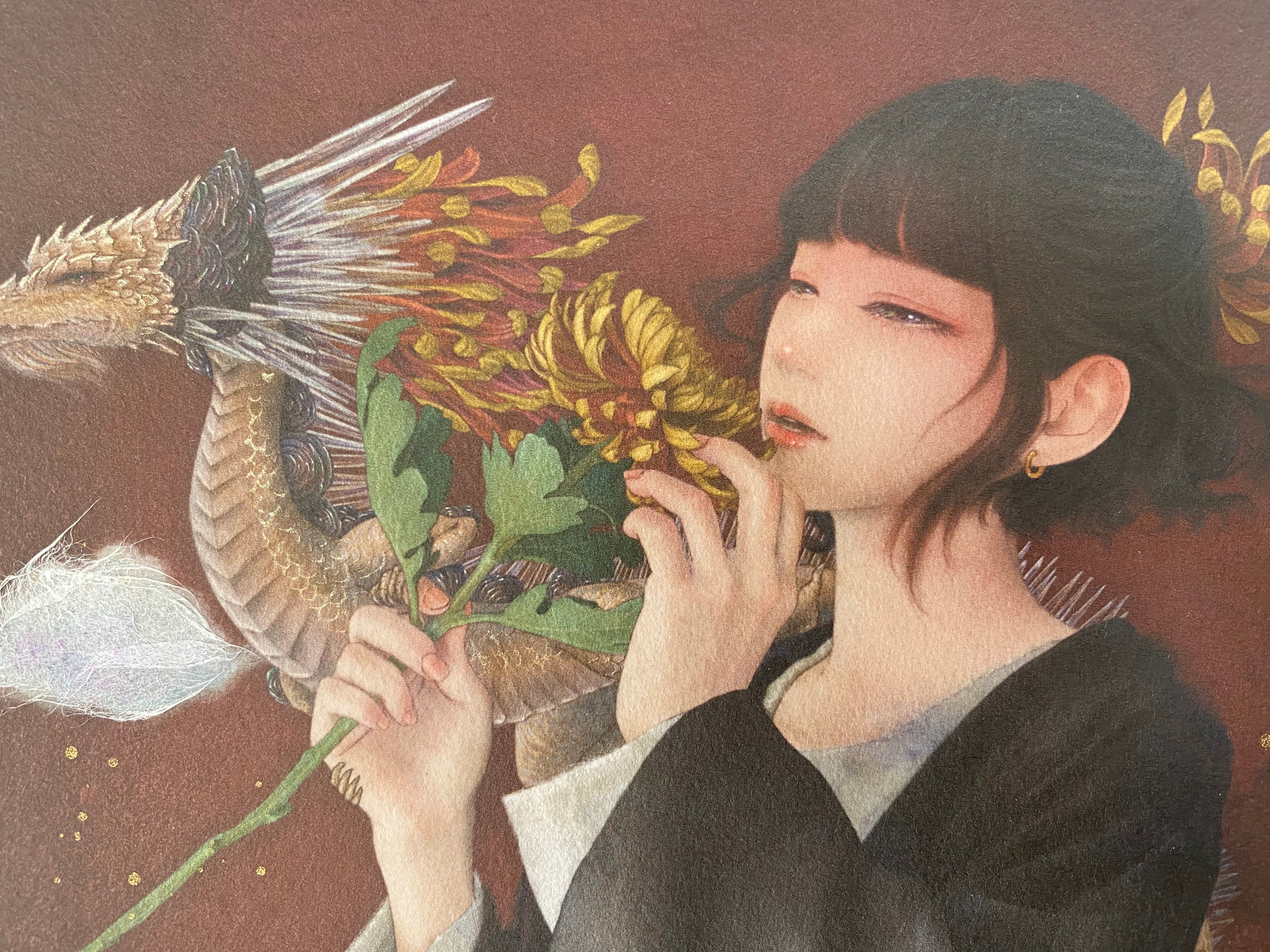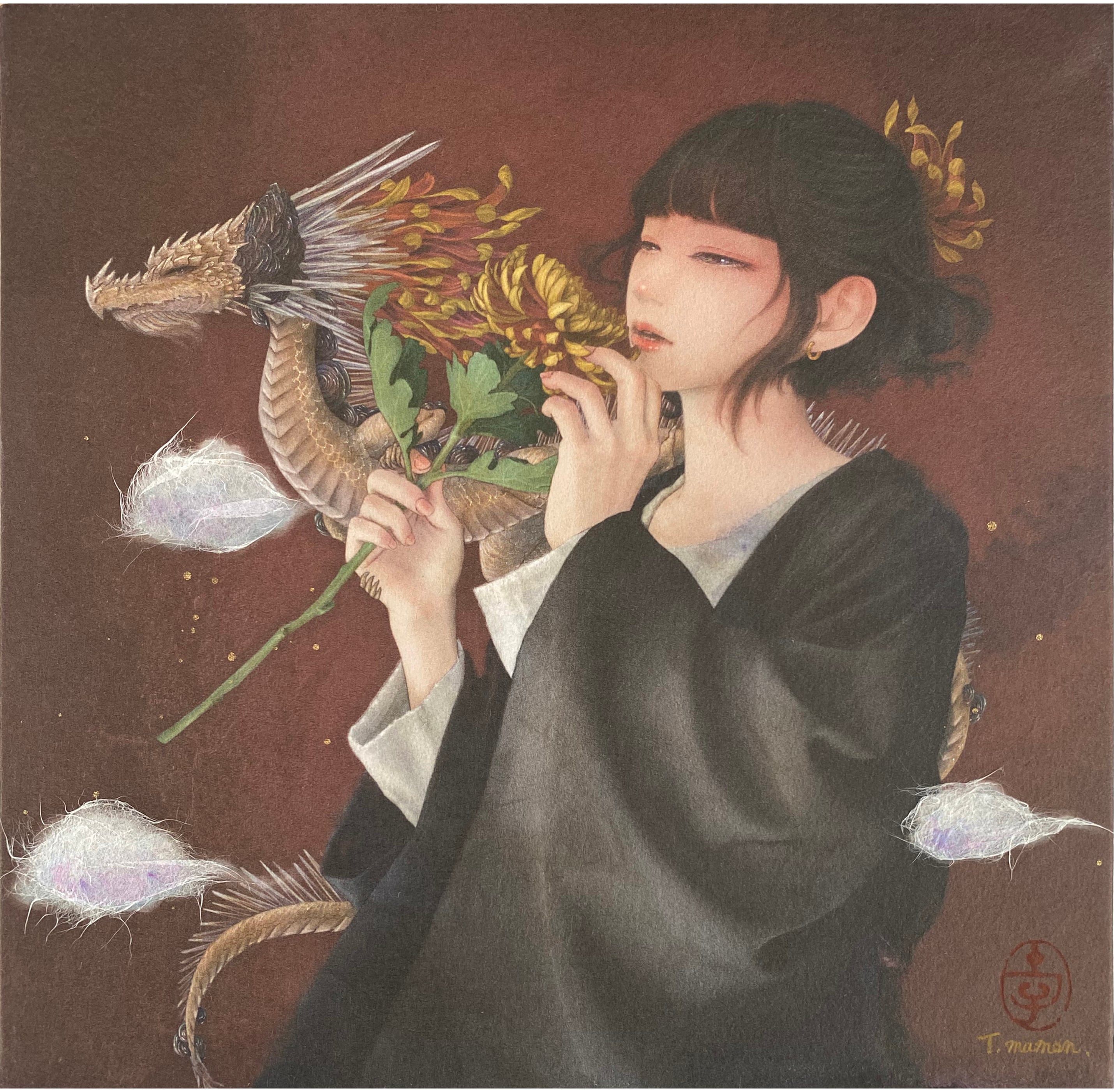 手書きで下図を描き、それをPCに読み込みPhotoshopにて着彩。和紙に出力した後、木製パネルに水張りを行い、そこからまた筆を持ち、顔彩で着彩しております。