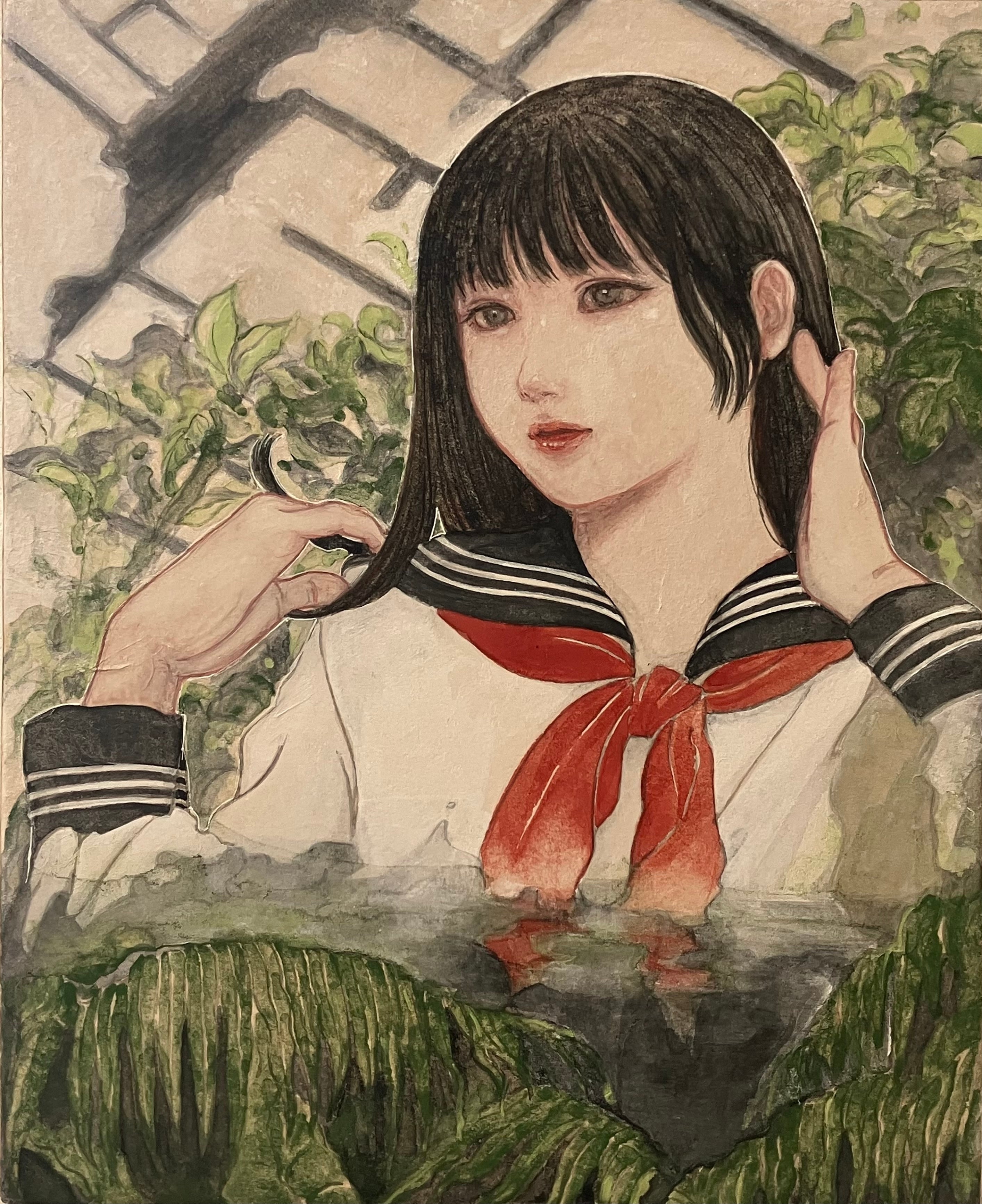 F3(273×220mm)。木製パネル、雲肌麻紙。岩絵具、墨、胡粉、アクリル。